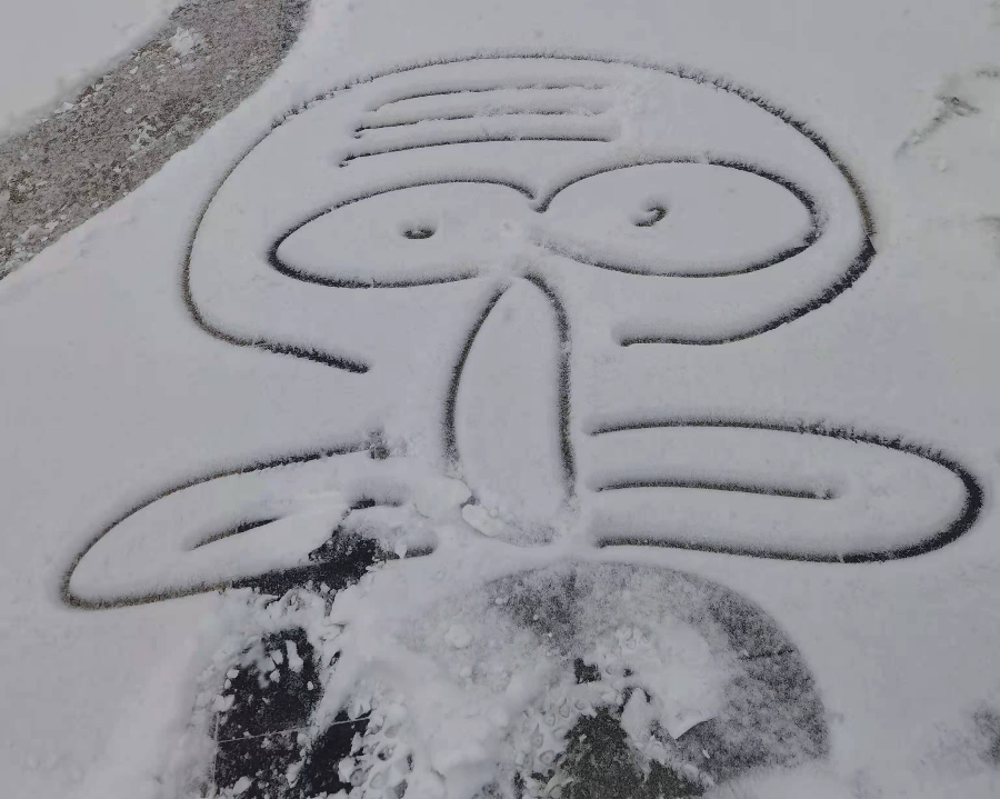 2月13日,志愿工作行将结束时,下了很大的雪,志愿者们自发展开道路清洁工作,一百多位志愿者,身着统一的蓝白相间的志愿者服装,羽绒服纯洁的瑞雪白与周身雪地融为一色,明亮的天霁蓝与头顶蓝天遥相呼应,伙伴们一齐拿着各式清扫工具扫除站岗路面附近人行道的积雪。忙碌间隙,有的志愿者堆起了雪人,有的打雪仗。雪花纷纷,白茫茫一片的雪地里,宋恩周拿起工具,自顾自画起了一个大大的章鱼哥的简笔画,三条抬头纹,两双椭圆的眼睛,长长的鼻子,鼓起的腮帮,怨怼又可爱。