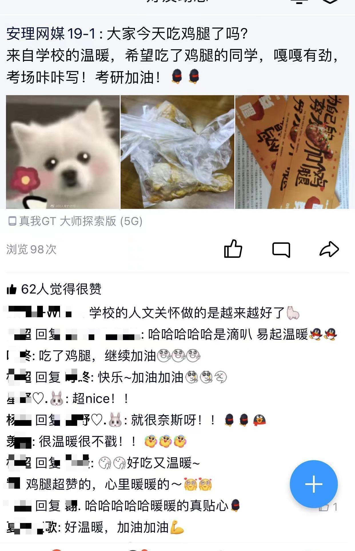 晚上,学校仁苑、爱苑和义苑食堂总共设有八个爱心窗口,同学们凭学校发的鸡腿券就可以在窗口领上一份热腾腾的美味大鸡腿。经济与管理学院2019级会计1班的殷悦说:“辅导员将餐券递给我,对我说‘去食堂加个鸡腿吧!最后阶段了,坚持住啊!’瞬间我就泪目了,我一定会拿出最好的状态冲刺!”“学校的鸡腿券真的很有爱!让我想到考研一路以来的辛苦坚持!我一定会加油的,不辜负自己,也不辜负大家的期待!”安全科学与工程学院2019级7班的陈彦木说到。来自人文社会科学学院的2019级网络与新媒体专业的杨超同学兴奋地说:“鸡腿很大很好吃,谢谢学校对我们的关心!我肯定能有很多的力气在考场上咔咔写试卷的!”