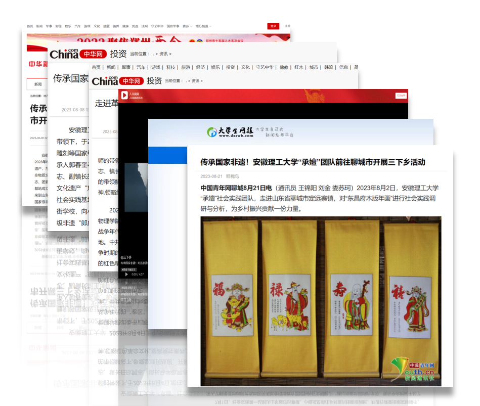 2023年“三下乡”大学生暑期社会实践活动,学校共组建164支校级以上重点团队和专项实践团队,其中国家级重点和国家级专项实践团队38支,省级重点和省级专项实践团队54支。力学与光电物理学院“承嬗”实践团是由力学与光电物理学院应用物理专业21-1班王锦阳同学担任负责人,朱梁、陈阳、汪月琴老师担任指导教师的校级重点美育专项。团队利用假期前往山东省聊城市道口铺镇和定远寨镇开展了一系列围绕非遗文化传承的实地调研和志愿服务活动。团队针对以国家级非物质遗产“东昌府木版年画”为代表的一系列非物质文化遗产展开调查研究,将线上、线下的调研数据利用SPSS进行数据分析,计算克隆巴赫系数进行信度分析、并通过KMO和巴特利特球形检验进行效度分析,深入分析了“东昌府木版年画”的地理人文成因和发展历史、木版年画工艺流程和目前发展面临的困境,最终形成近2万字调研报告。团队还将资料整合,为当地东街小学开设一系列非遗传承公益课程,普及非遗文化。团队事迹被中国青年网、中华网、央视频、人民视频等20余个国家级、省部级等媒体平台进行宣传报道。