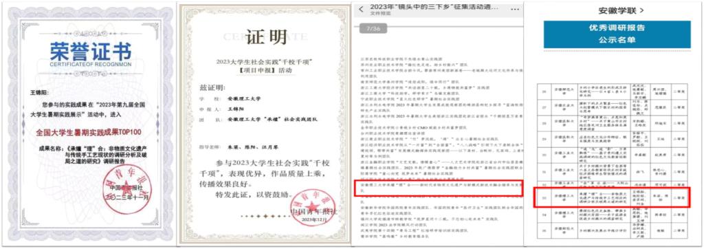 近日,共青团中央、团安徽省委分别通报了2023年全国和安徽省大中专学生志愿者暑期文化科技卫生“三下乡”社会实践活动中表现突出的优秀集体、个人、项目和成果。力学与光电物理学院“承嬗”社会实践团斩获多项荣誉!团队在“2023年第九届全国大学生暑期实践展示活动”评选结果中获评“全国大学生暑期实践成果TOP100”、在2023年大学生社会实践“千校千项”项目申报活动中荣获优秀成果、获2023年“镜头中的三下乡”优秀文字成果荣誉、获2023年全省大中专学生志愿者暑期“三下乡”社会实践活动“优秀调研报告”等多项荣誉。