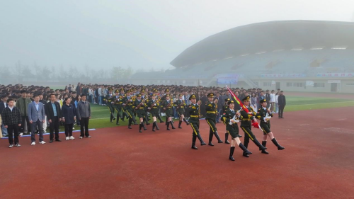 在庄严的国歌声中,鲜艳的五星红旗由国旗护卫队缓缓升至杆顶,迎风飘扬。全体师生高唱国歌,肃立行注目礼,向伟大祖国致以崇高的敬意。