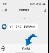在公众号会话页面,点击底部菜单栏【校友服务】进入服务大厅
