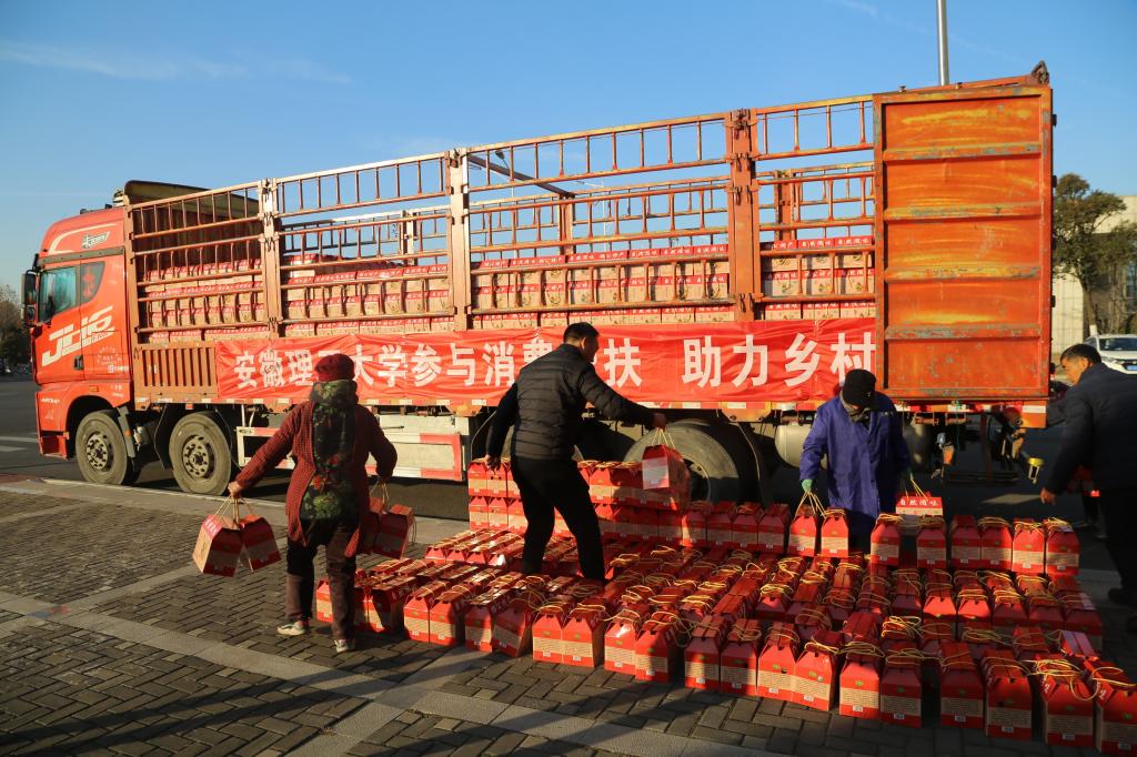1月9日,在春节来临之际,学校将乡村振兴消费帮扶与教职工春节福利发放有机结合,将从定点帮扶的谢家集区汤王村和高新区三和镇新华村采购的大米、杂粮、香菇等41万余元的绿色农产品发放给教职工,向教职工致以春节的问候和祝福。