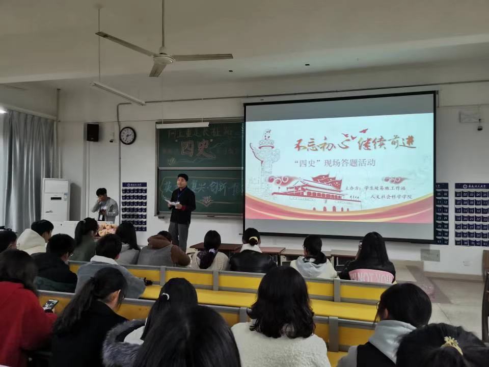 11月21日下午,校易班发展中心联合人文社会科学学院在天工南314举办“学习四史文化,传承时代精神”知识竞赛。来自人文社会科学学院的6支学生参赛队伍展开了精彩比拼,为观众带来了一场精彩绝伦的知识盛宴。