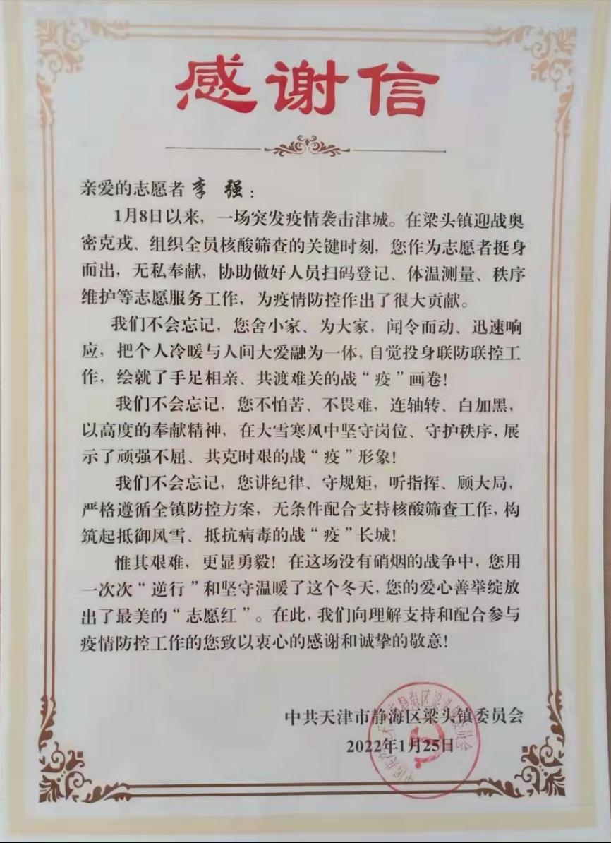 近日,土木建筑学院收到来自中共天津市静海区梁头镇委员会的一封感谢信,信中对该院城市地下空间2019-2班学生李强积极参与社区疫情防控志愿服务提出表扬。