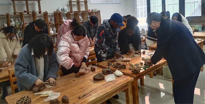 王静为学生们讲解了安徽陶瓷尤其是淮南寿州窑悠久的历史文化以及陶艺制作的基本技能,通过揉泥、制备泥条学生们体会到了陶艺泥条成型这一手法的灵活性和多样性。崔怀伦手把手地带学生体验了寿州窑手工瓷的制作过程,通过压模成型技法制作了精美的传统挂件。学生们对陶瓷技法和寿州窑手艺传承表现出了强烈的兴趣,留学生更是对寿州窑陶瓷制作过程的精巧细致感叹不已。