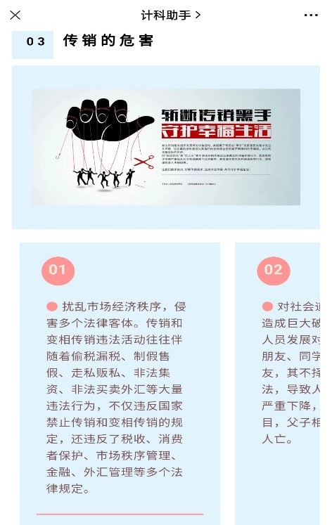 为了提高学生的自我防范意识,10月30日,学院利用微信、视频图片等宣传资料在学院计科助手、安理计算机等微信平台进行推送,用图片展示的形式加强学生的防范意识,取得了宣传教育的良好效果。