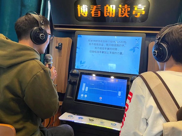朗读亭集朗读、录制、演讲训练等功能为一体,读者通过扫描屏幕的二维码登录页面即可使用。朗读系统中包含诗歌、散文、电影对白等朗读材料,读者可根据自己的喜好选择朗诵配乐。朗读结束后,录音文件可录制到系统中,读者可以通过手机查看录音作品并分享至朋友圈。