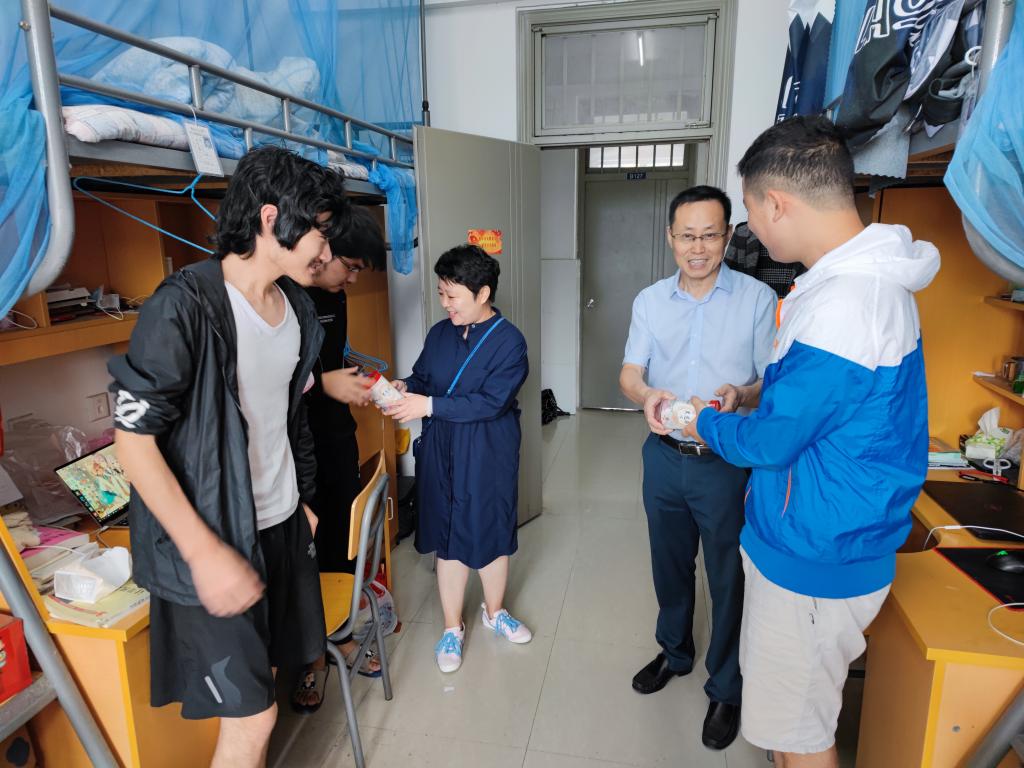 在高年级学生宿舍,领导们向同学们致以节日的问候,并为每位同学送上了月饼。学院党委书记谢中根表示,在中秋节这样一个团圆的节日里,为了落实疫情防控要求,非必要情况不得离淮,许多同学无法回家与家人团聚,感谢同学们对疫情防控各项工作的支持,希望同学们在数大学院这个温暖的大家庭里度过美好的中秋佳节。