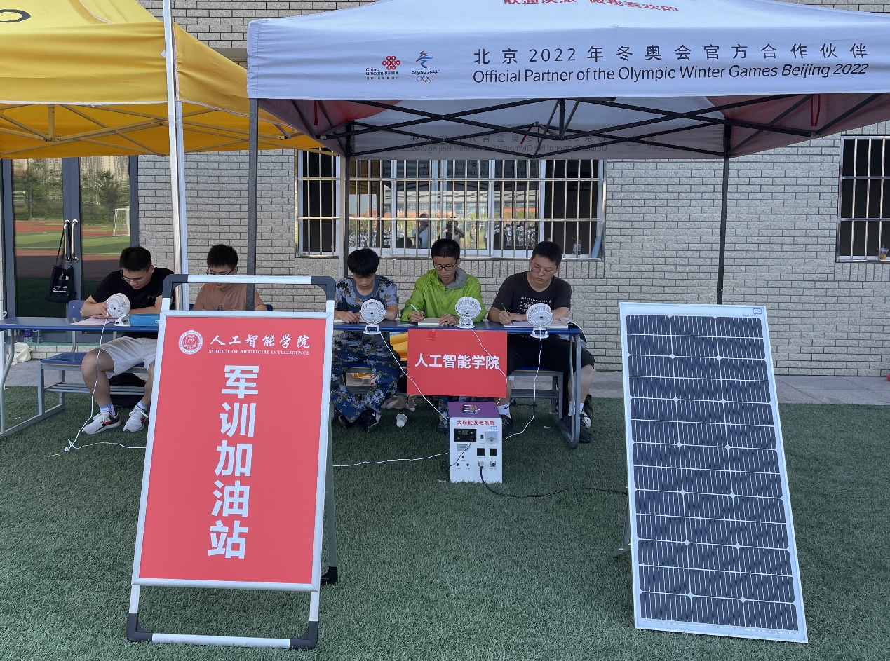 人工智能学院利用专业优势,组建研发小组,研制可持续使用、节能环保、方便服务的“军训加油站”,切实为师生办实事。在学院院长王成军的指导下,党员教师田兴、李龙和部分研究生利用太阳能板、蓄能电池和整流逆变等,“DIY”了一套微电网系统,该系统通过太阳能为电池充电,提供了可持续电源。学院又配备了小型电风扇、烧水壶、充电装置等,解决了军训场地手机充电难、避暑难等问题。