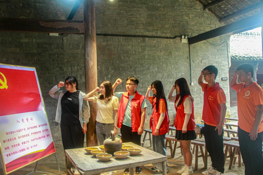 7月29日上午,志愿者们辗转来到汤家汇红色小镇,革命旧址内一张张珍贵的历史图片、一件件厚重的历史文物仿佛都在向志愿者们诉说着革命先烈的英勇事迹,带领大家走入那个血雨腥风的时代,体会革命先烈不怕困难、不怕牺牲、英勇不屈的伟大爱国情怀。“我志愿加入中国共产党,拥护党的纲领... ...”,面对鲜艳的党旗,师生们在党史教育基地庄严宣誓,每名志愿者都感受到了作为青年大学生自己身上的时代责任和历史使命。最后,志愿者们通过合唱《八月桂花遍地开》感受当年红军的革命精神,追忆红军战士。