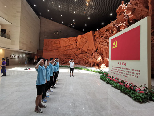 在渡江战役纪念馆,学生党员们认真观看了各类图片、文字、影像资料和珍贵历史文物,追忆了百万雄师过大江的恢弘历史,重温了那段波澜壮阔的人民解放战争历程,切身感受了中国共产党领导中国人民取得胜利的坚定信念以及革命先烈不怕牺牲、无私无畏的英雄气概。在沉浸式的洗礼下,学生党员面对鲜红的党旗重温了入党誓词。