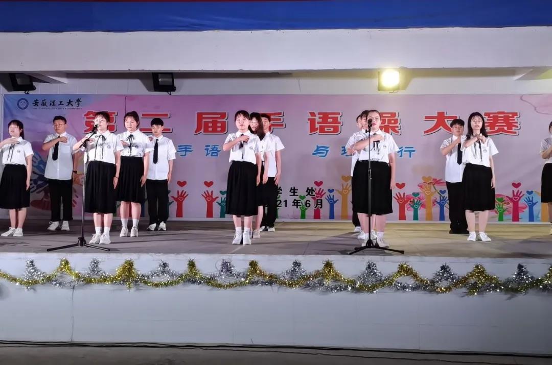 比赛中,各学院代表队以手语为主要表现形式,将弹唱、朗诵、情景剧等艺术手法融入表演当中,为现场观众带来了一场精彩纷呈的视觉体验以及心灵上的感悟。医学院《明天你好》再现在抗击新冠疫情大考中,医护人员不畏艰难、勇于担当的精神和勇气;材料科学与工程学院《唱支山歌给党听》紧紧贴合建党一百周年的主题表达同学们对党的热爱与崇敬;矿业工程学院《逆光》表现出大学生在逆境中成长、追求梦想、奔向希望的心路历程;地球与环境学院《听我说谢谢你》表达出学子与祖国共成长、争做新时代的追梦人的心声;计算机科学与工程学院《仰望星空》,一群有梦想的少年演绎相互扶持、携手前进、共同成长的团结精神。