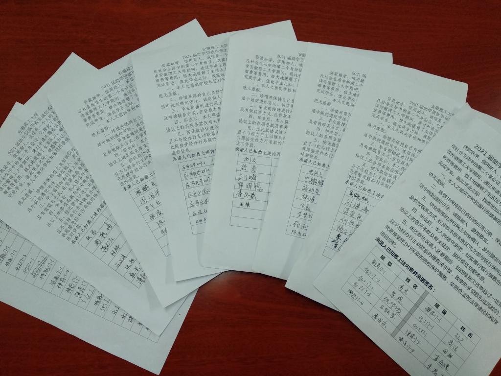 签订诚信承诺,践行诚信理念。目前毕业班学生忙于写论文、找工作等,毕业班辅导员就采取与贷款毕业生进行一对一的诚信教育谈话,并重点向学生讲解了征信、信用知识以及还款流程,让学生充分认识到信用违约及不良征信记录可能带来的严重后果,科学指导、因人施策,与学生商量制定合理的还款计划。通过细致的工作,贷款毕业生均签订了助学贷款毕业生诚信承诺书,并表示一定会践行诚信理念,按时还款,做一名讲诚信、懂感恩的人,努力奋进、不断进取。