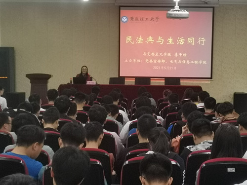 5月21日上午,安徽省和淮南市两级民法典宣讲团专家成员、马克思主义学院副教授李子煊做客“百川大讲堂”,在励行楼B112报告厅向师生详细解读民法典,进一步提高师生学法、守法、尊法、用法意识。报告会由电气与信息工程学院党委副书记徐泽绵主持。学院全体学工干部、各年级学生代表等180余人聆听讲座。