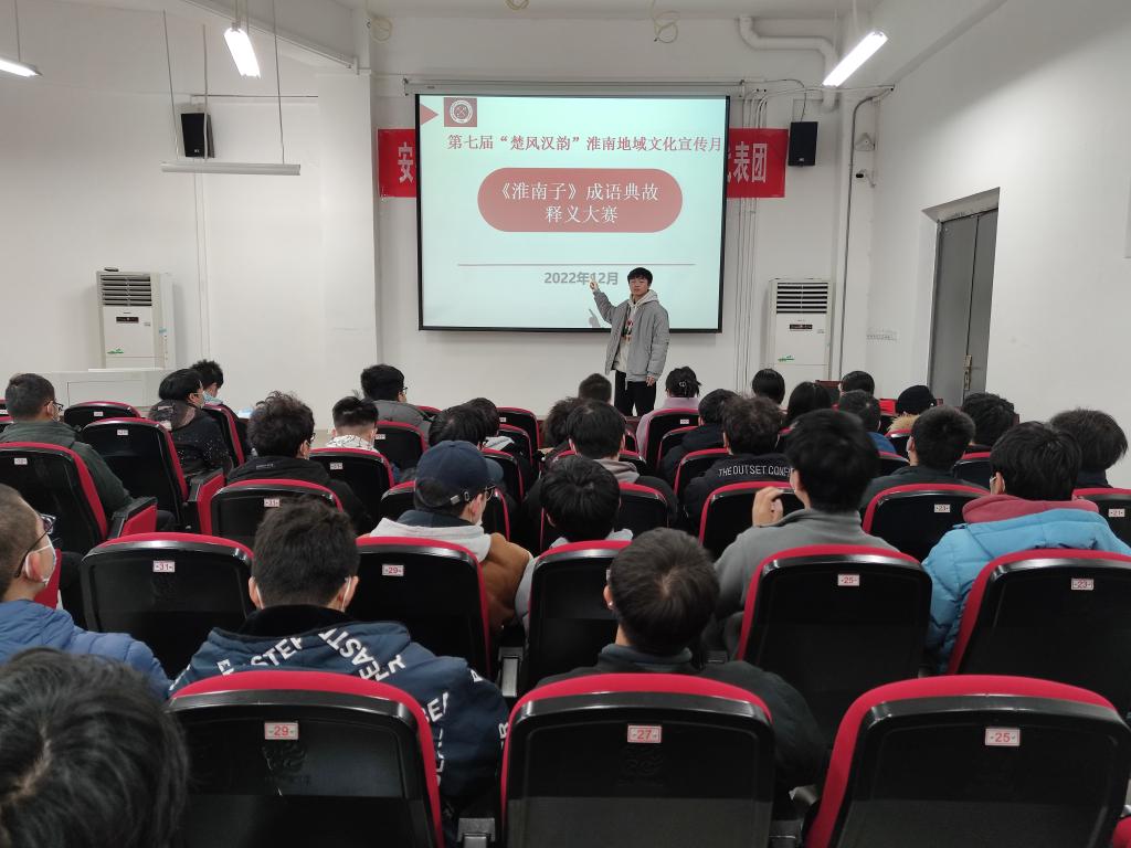 12月9日,《淮南子》成语典故释义大使选拔赛在崇礼楼102报告厅举行,来自6个学院20名同学经过线上报名、初赛后成功晋级。他们依次围绕“一叶知秋”“百川归海”“塞翁失马”“乐极生悲”“一人得道,鸡犬升天”“风声鹤唳”“草木皆兵”“投鞭断流”“当面锣、对面鼓”“人心不足蛇吞象”等成语,图文并茂地解释着这些耳熟能详、流传甚广的成语典故的诞生和推衍的故事。经过评审,弹药21-6班祁子豪、交通工程22-3班邓志杰等10位同学获《淮南子》成语典故十佳推广大使荣誉称号。