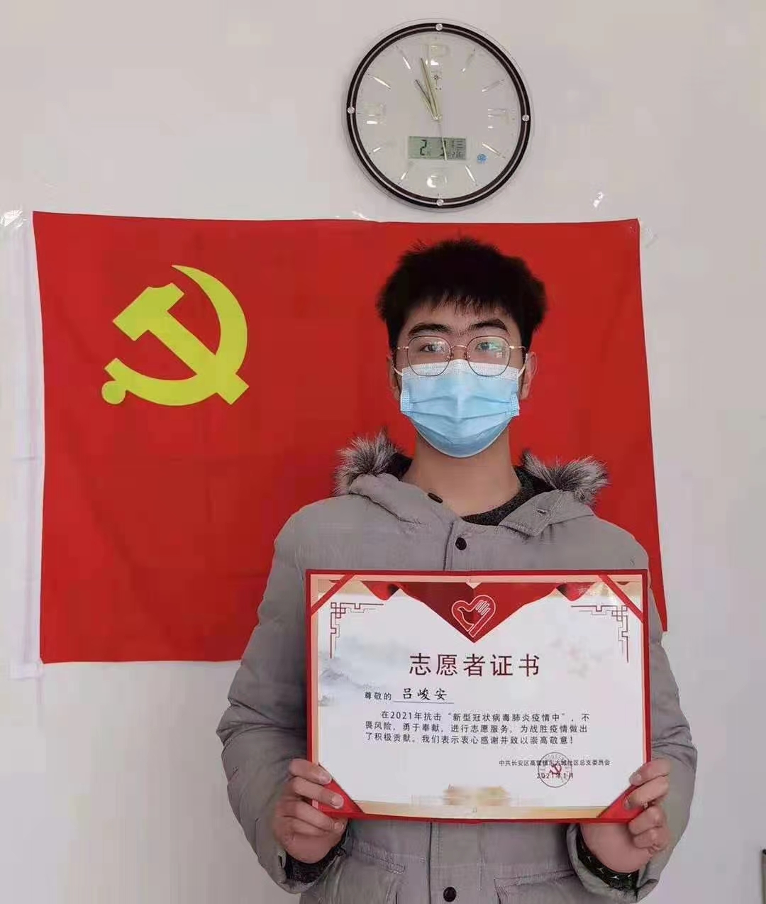 2021年1月2日,河北省石家庄市疫情出现反弹,吕峻安同学在放假后第一天便主动向当地社区报到,迅速投入志愿者工作。他不畏严寒,在零下八度的低温下为市民登记信息,协助医护人员进行核酸检测。吕峻安同学的志愿活动受到当地社区的表彰,被授予“优秀志愿者”称号。