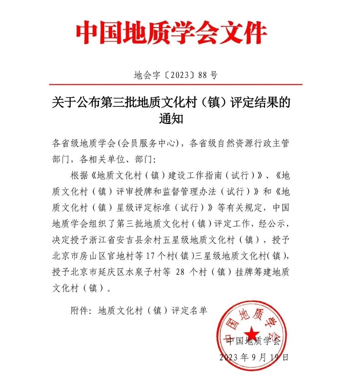 9月19日,中国地质学会公布了《第三批地质文化村(镇)评定结果》,由学校作为主要技术支撑单位申报的舒城县庐镇榴辉岩、V形峡谷地貌地质文化乡成功入选挂牌筹建全国地质文化村(镇)。