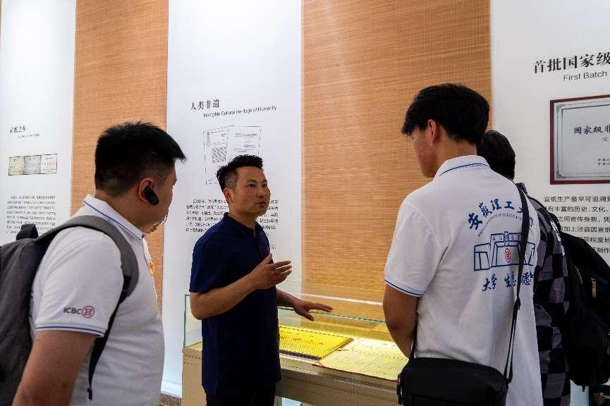 7月7日,实践团队来到宣城泾县宣纸文化园进行参观学习。作为首批入选国家级非物质文化遗产名录和联合国人类非物质文化遗产代表作名录的非遗,宣纸享有“纸寿千年”的美誉。至今,在宣纸的原产地安徽省宣城市泾县,仍沿用着明清时期生产宣纸的纯手工技艺。
