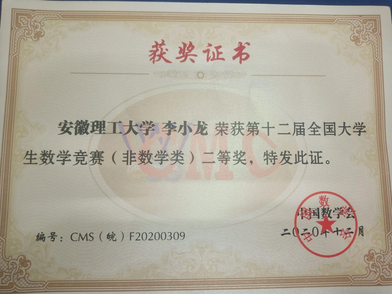 李小龙,电气与信息工程学院2019级自动化1班本科生,安徽理工大学第二届“数学明星奖”获得者。自大一入学以来,他在包括《高等数学》(上)、《高等数学》(下)、《线性代数》、《概率论与数理统计》4门公共基础课等在内的多门科目中均取得100分满分,成绩骄人;同时他还多次获得“三好学生标兵”、“优秀共青团员”等荣誉称号;他积极参与大型赛事,参与多个数学学习与学科竞赛,曾获2021年11月全国大学生数学竞赛安徽赛区二等奖,2020年12月全国大学生数学竞赛安徽赛区二等奖,2020年9月安徽理工大学数学竞赛校一等奖,2021年6月安徽理工大学数学竞赛校一等奖;还参与各级建模比赛,曾获2021年9月全国大学生建模比赛省一等奖,2021年4月认证杯第一阶段二等奖,2021年5月认证杯第二阶段二等奖,2020年10月安徽理工大学数学建模竞赛校一等奖。