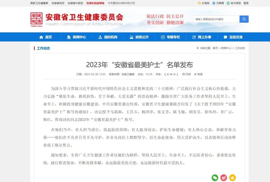 为大力弘扬“敬佑生命、救死扶伤、甘于奉献、大爱无疆”的崇高精神,激励全省广大医务工作者坚持人民至上、生命至上,积极投身健康安徽建设,5月26日,中共安徽省委宣传部、安徽省卫生健康委联合印发了《关于授予2023年“安徽省最美护士”称号的通知》,学校一附院章广云护士长荣获该项荣誉称号!