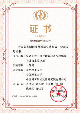 近日,中国发明协会第八届四次理事会和会员代表大会、第十八届中国发明家论坛暨发明创业奖颁奖典礼在北京中国科技会堂举行。会上表彰了第十三届发明创业奖人物奖和创新奖。我校戴勇教授被授予“第十三届发明创业奖·人物奖”。我校教师刘小虎、陈登红参与的“复杂条件下深井软岩巷道失稳锚固关键技术及应用”项目荣获“发明创业奖·创新奖”一等奖。