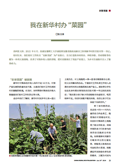 文章指出,自2021年被学校选派到淮南市高新区三和镇新华村担任驻村第一书记以来,张文涛始终牢记学校党委殷殷重托,充分发挥所在驻村自身优势,带领驻村工作队以“安新菜园”为产业基石,全力打造集休闲娱乐、种植体验、劳动锻炼等功能为一体的文旅基地,改善了村集体收入低的窘境,把村民镶嵌在了致富产业链上,为乡村全面振兴注入了强劲动力。