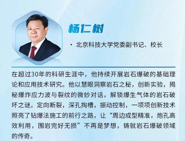 杨仁树,现任北京科技大学校长,中国爆破行业协会副会长、中国安全生产协会副会长。先后获国家科学技术进步二等奖3项,国家技术发明二等奖1项,国家级教学成果二等奖1项,省部级科技进步一等奖9项。作为项目负责人或主要参与人,先后承担国家863计划项目、国家自然科学基金重点项目、国家科技支撑计划、国家重点研发计划等项目20多项,发表学术论文100余篇(其中SCI、EI检索论文60多篇),出版专著、教材4部,获国家发明专利40余项。