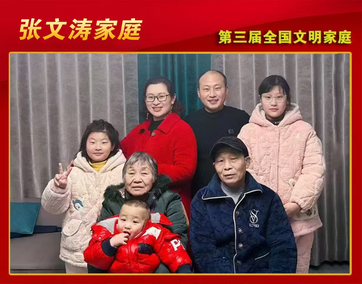 张文涛与妻子王珍在各自岗位发光发热,张文涛一家用爱与责任书写着文明家庭的动人篇章。2021年6月至2024年6月,张文涛主动投身乡村建设,作为第八批选派干部,率领工作队助力淮南市高新区新华村脱贫攻坚与乡村振兴,三年食宿于村,一心扑在工作上。王珍是淮南市第六中学教师,克服重重困难,精心备课,勇挑多年级课程教学重担,助力学子夺魁。面对年迈患病的父母,张文涛和王珍悉心尽孝,每周两次为因病致残卧床11年的父亲清洗身体、陪其康复训练,父亲十几年没生过一个褥疮,王珍常为腰痛的婆婆按摩缓解疼痛。他们一家还是邻里和睦的典范,客厅成为邻里聚会之所,夫妻俩乐于助人,扶老携幼、照看邻家稚子。女儿也化身“小帮手”,帮小伙伴复习功课。张文涛家庭以实际行动传承古训,夫妻俩爱岗敬业、真诚待人;孩子们勤学善思、积极向上。一家人和睦相处,在单位和邻里间传为佳话,践行时代新风,传递了向上向善的正能量,张文涛家庭先后被授予淮南市文明家庭、安徽省五好家庭、安徽省文明家庭称号。2025年,张文涛家庭获评第三届全国文明家庭称号。