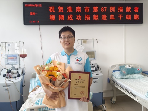 献血救人贯穿了程翔大学四年。2021年12月4日,在参与校红十字会造血干细胞捐献宣传活动时,他带头献血并留取血样,大学期间累计献血五次。2023年7月,首次获悉与患者初配成功,他当即同意捐献,后因患者病情变化终止,深感遗憾。2025年5月22日,正值毕业繁忙时,他再次接到配型成功通知,当天正是程翔的生日,他视其为特殊生日礼物,积极配合完成高分辨匹配与体检,以患者为重静候捐献安排。6月13日,他刚回到河南老家便接到淮南市红十字会的捐献通知,立即在父亲陪伴下返程配合捐献。朴实的父亲说:“儿子是去救人,是行善,我得陪着他,为他做点事,给他加加油。”