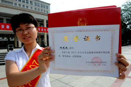 6月26日,安徽理工大学外国语学院英语专业2013届毕业生何延延开心展示大学生志愿服务西部计划志愿者荣誉证书,奔赴池州市东至县偏远乡村开展为期一年的基层青年工作。