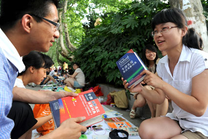 图三:何延延(右)在校园跳蚤市场中将用过的学习用品、工具书低价处理给低年级学生。