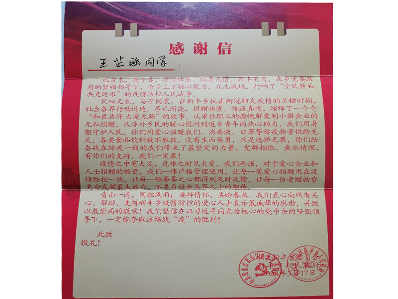新冠肺炎疫情的暴发,让本该在家欢度春节的王芷涵一家人都投进了紧张忙碌的疫情防控工作中去。王芷涵父亲是当地村委会的党支部书记,母亲是乡政府卫健办的工作人员。王芷涵非常理解和支持爸爸妈妈的工作,主动承担起家务,做饭、洗衣、搞卫生……每件事都做得井井有条、一丝不苟。当得知乡里招募志愿者参与防控工作时,她第一时间就报名参加了。“父母都奋战在防控一线,我也要紧跟他们的步伐参与其中,作为一名大学生,我有知识有活力,更应该发挥自己的作用。”王芷涵这样说道。因在疫情防控志愿活动中表现优秀,她收到了来自黄山市黄山区新丰乡党委和政府的感谢信。