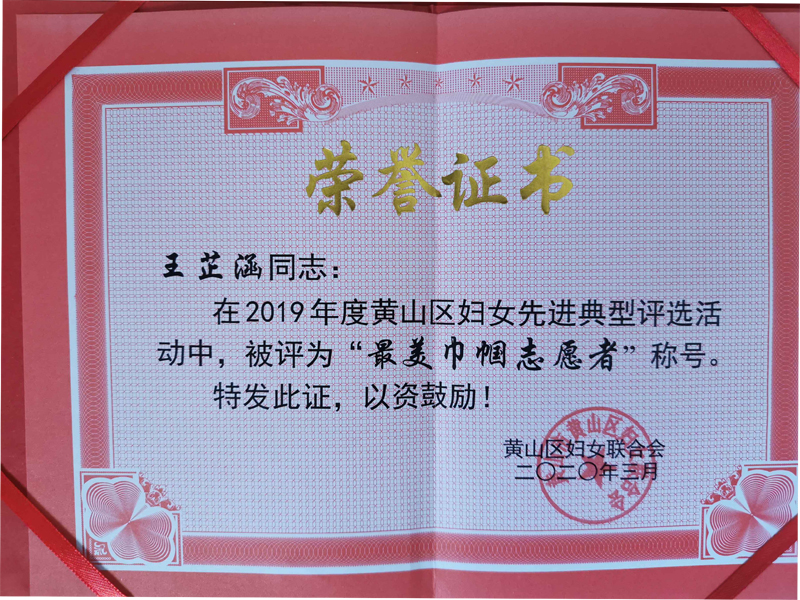 近日,安徽理工大学经济与管理学院人力资源管理专业2019级学生王芷涵因在安徽省黄山市黄山区新型冠状肺炎疫情防控志愿工作中表现突出,被当地妇联评为“最美巾帼志愿者”。