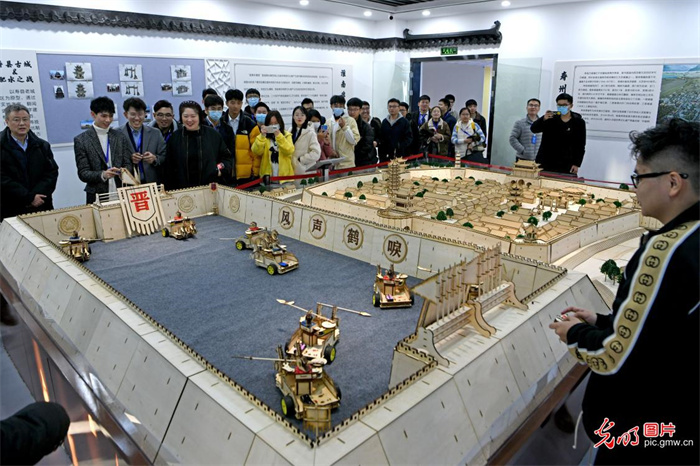 2021年11月23日,安徽理工大学第三届皖台高校科技文化交流论坛开幕,两岸青年师生通过科创主题线上线下交流,科创基地体验互动,参观走访淮南市高新技术企业等多种形式,共话青年创新创业。图为中国台湾师生与安徽理工大学大学生通过战车机器人模拟体验淝水之战。(陈彬摄/光明图片)