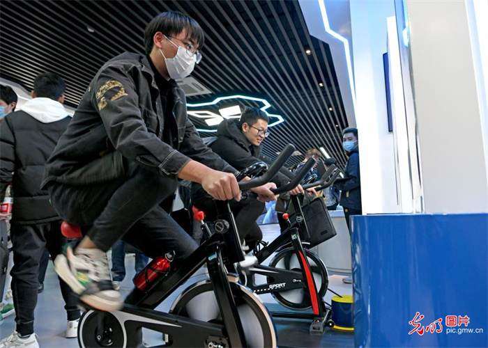 2021年11月23日,安徽理工大学第三届皖台高校科技文化交流论坛开幕,两岸青年师生通过科创主题线上线下交流,科创基地体验互动,参观走访淮南市高新技术企业等多种形式,共话青年创新创业。图为中国台湾师生与安徽理工大学大学生体验骑自行车发电。(陈彬摄/光明图片)