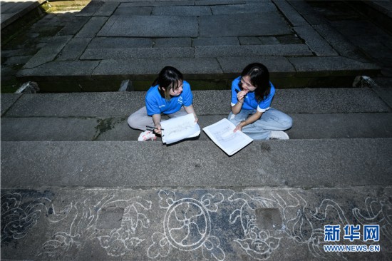 7月15日,服务团的学生对查济的宝公祠地面纹理进行绘制收集。