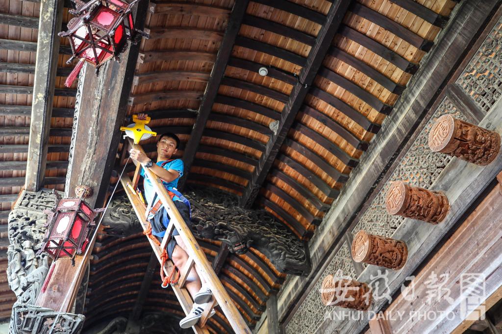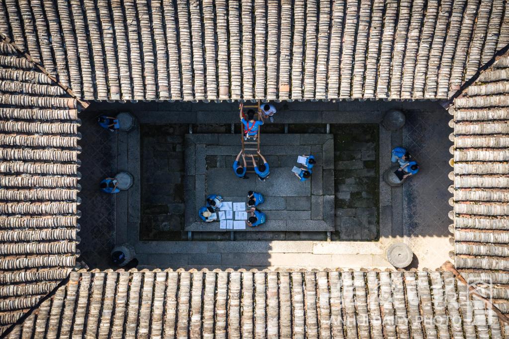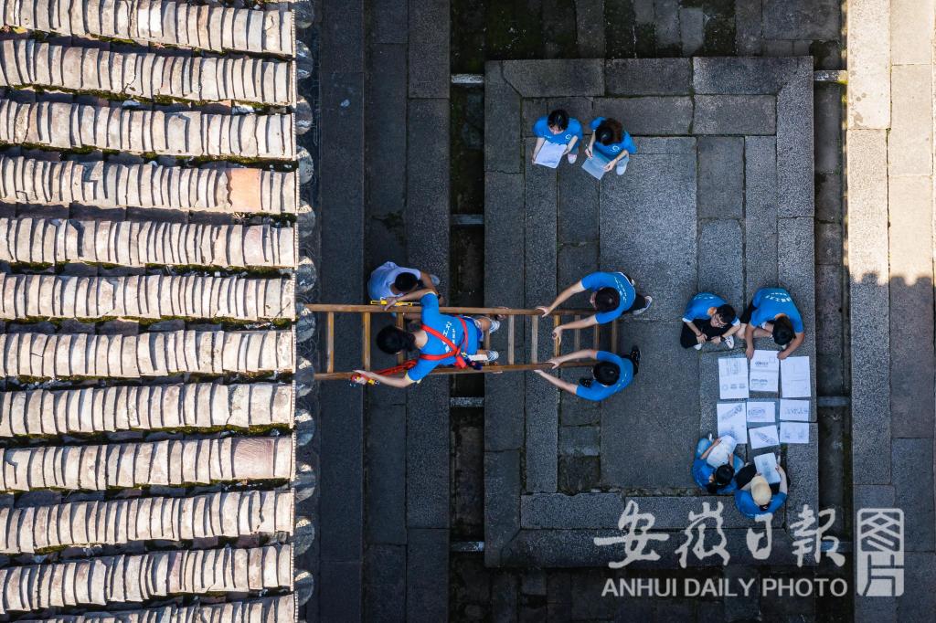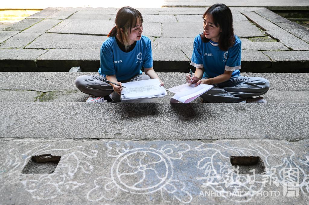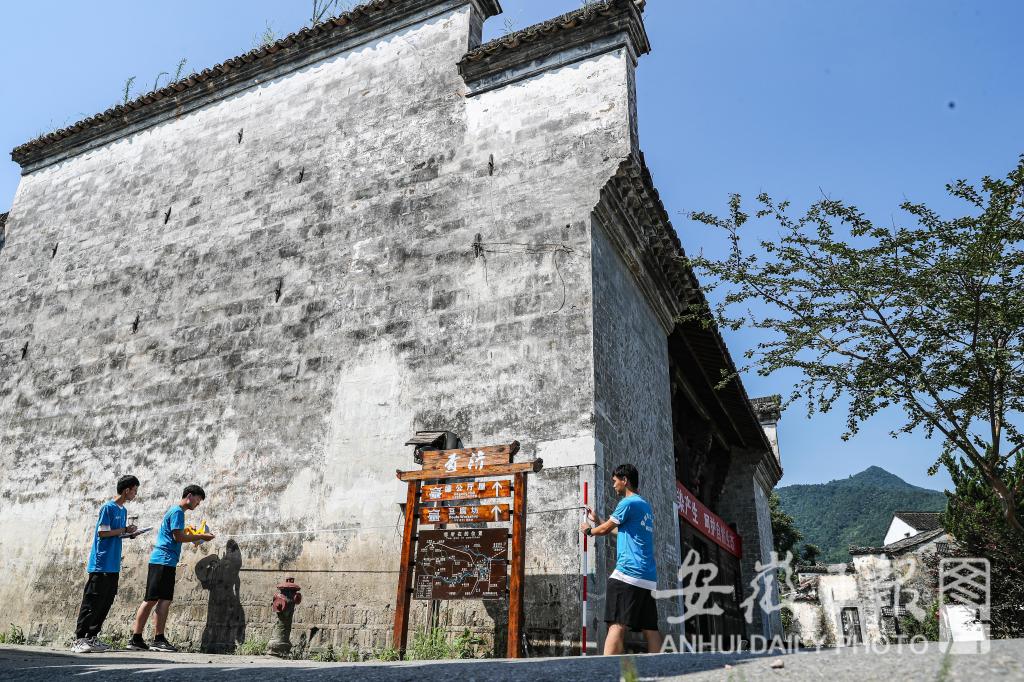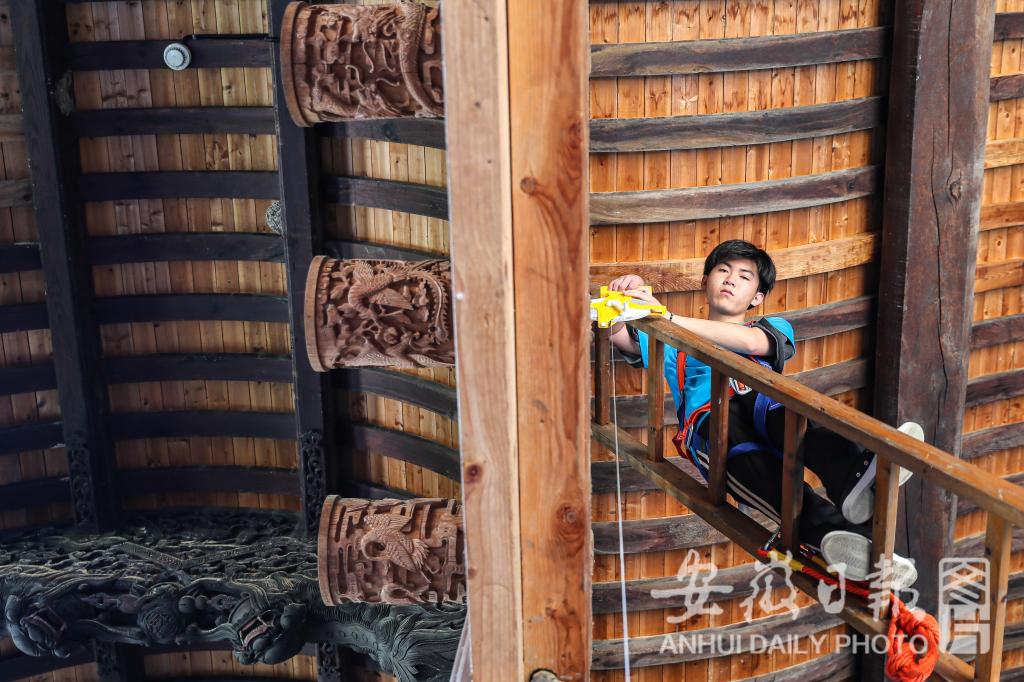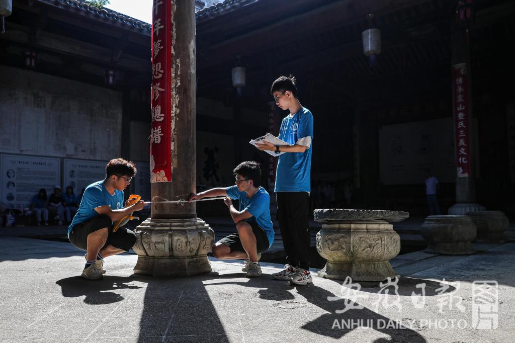 7月15日,绿树掩映下的查济古镇里,一群身着蓝色文化衫的学生们,在白墙灰瓦的徽州古建筑里穿梭着。他们用举着高高的梯子,爬上年代久远的古祠堂。用手里的尺子,测量古祠堂的每一个角落,用手里的笔,记录下每一块精雕细刻的木雕