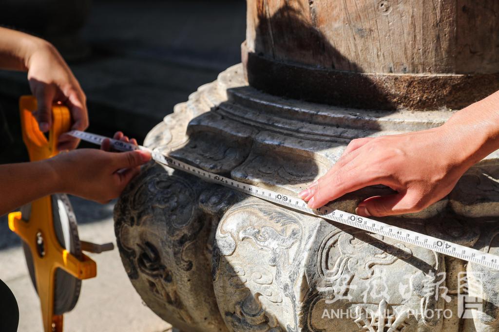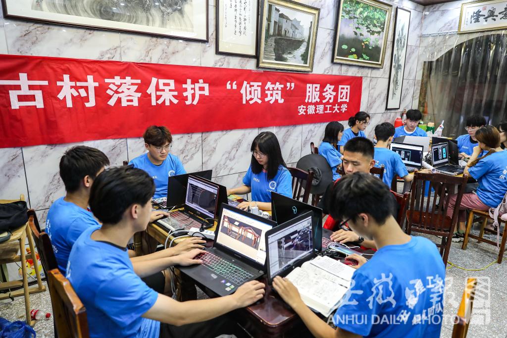 这群蓝衣服的学生,是来自安徽理工大学“倾筑”服务团的学子。多年来,服务团的学子坚持对各地古建进行测绘,记录其的“生命密码”,在古建损毁后,可确保原样重建。
