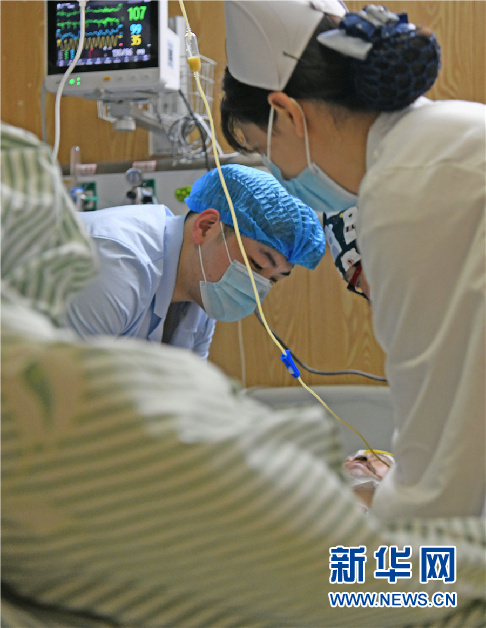 5月10日凌晨,安徽理工大学第一附属医院神经重症监护病房内,夜班中的“00后”男护士段青龙为患者进行吸痰护理。
