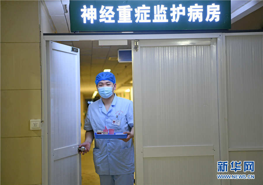 5月10日凌晨,安徽理工大学第一附属医院神经重症监护病房内,夜班中的“00后”男护士段青龙正紧张忙碌地工作。