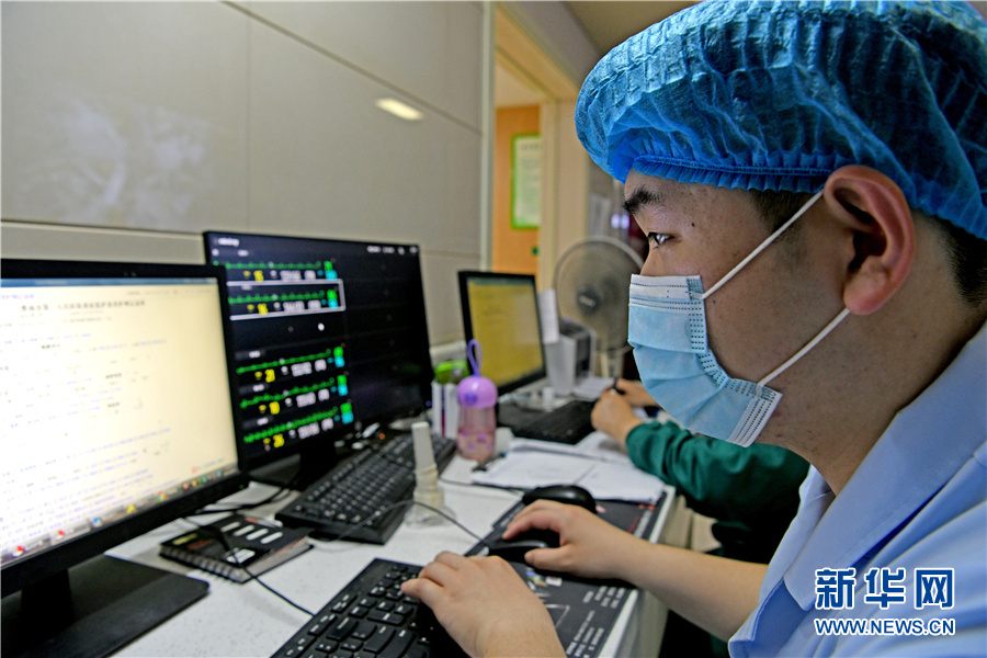 5月10日凌晨,安徽理工大学第一附属医院神经重症监护病房内,夜班中的“00后”男护士段青龙记录电子病历。