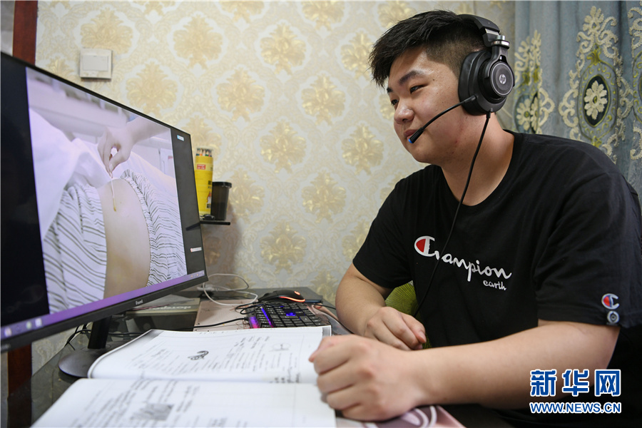 5月9日,安徽理工大学第一附属医院“00后”男护士段青龙休息在家,通过视频教学,学习护理知识。
