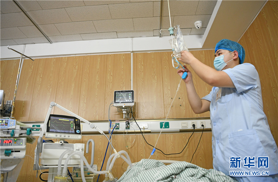 5月10日凌晨,安徽理工大学第一附属医院神经重症监护病房内,夜班中的“00后”男护士段青龙为患者输液。