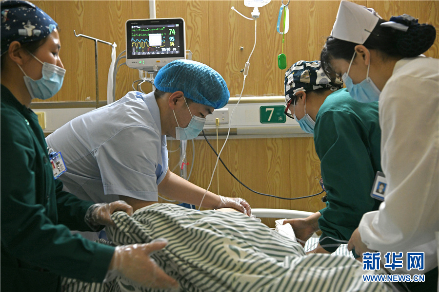 5月10日凌晨,安徽理工大学第一附属医院神经重症监护病房内,夜班中的“00后”男护士段青龙与同事为患者进行精心护理。