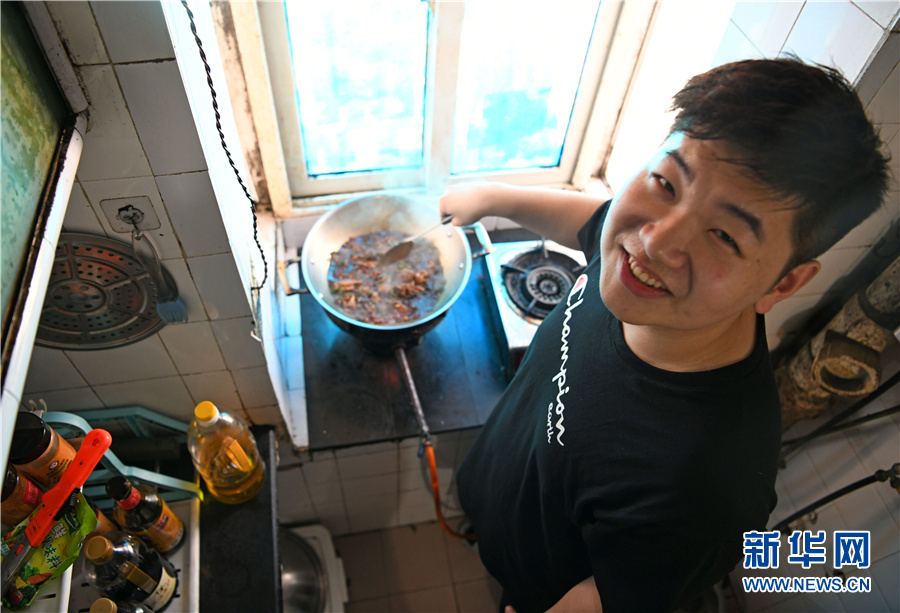 5月9日,安徽理工大学第一附属医院“00后”男护士段青龙休息在家烧饭,帮助父母做家务。