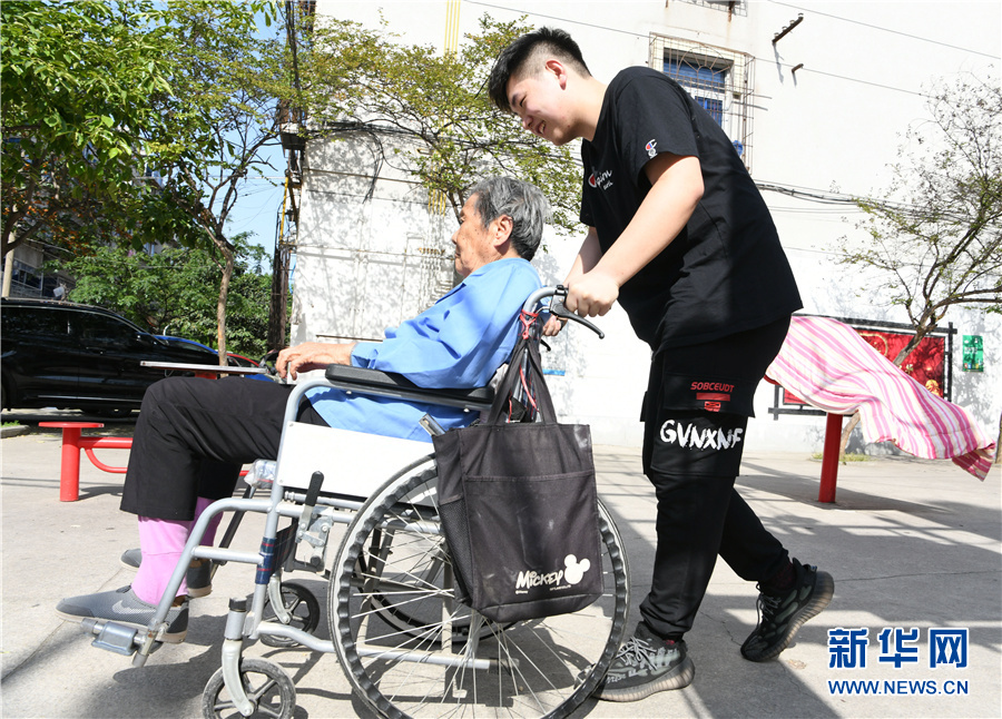 5月9日,安徽理工大学第一附属医院“00后”男护士段青龙休息在家,发挥护理特长,志愿帮助社区老人活动身体,宣传健康知识。
