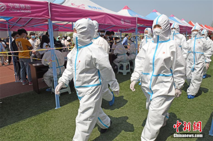 4月6日,安徽理工大学第一附属医院医护人员在操场上为安徽理工大学32000余名师生进行第六轮全员核酸检测。截至4月6日24时,淮南市报告本地确诊病例9例,目前在院治疗9例;尚在医学观察的无症状感染者333例。图为安徽理工大学第一附属医院党员医护人员冲锋在前。 陈彬 摄