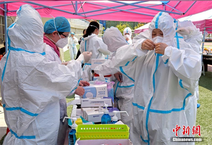 医护人员整理防护服准备进行核酸采集。 陈彬 摄