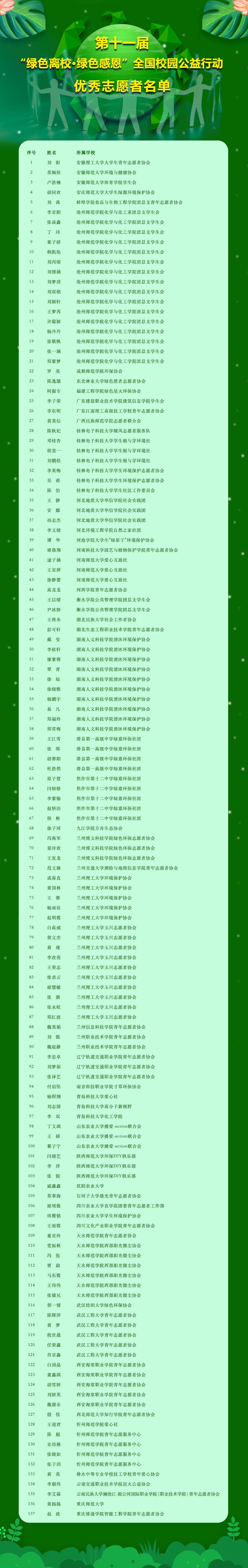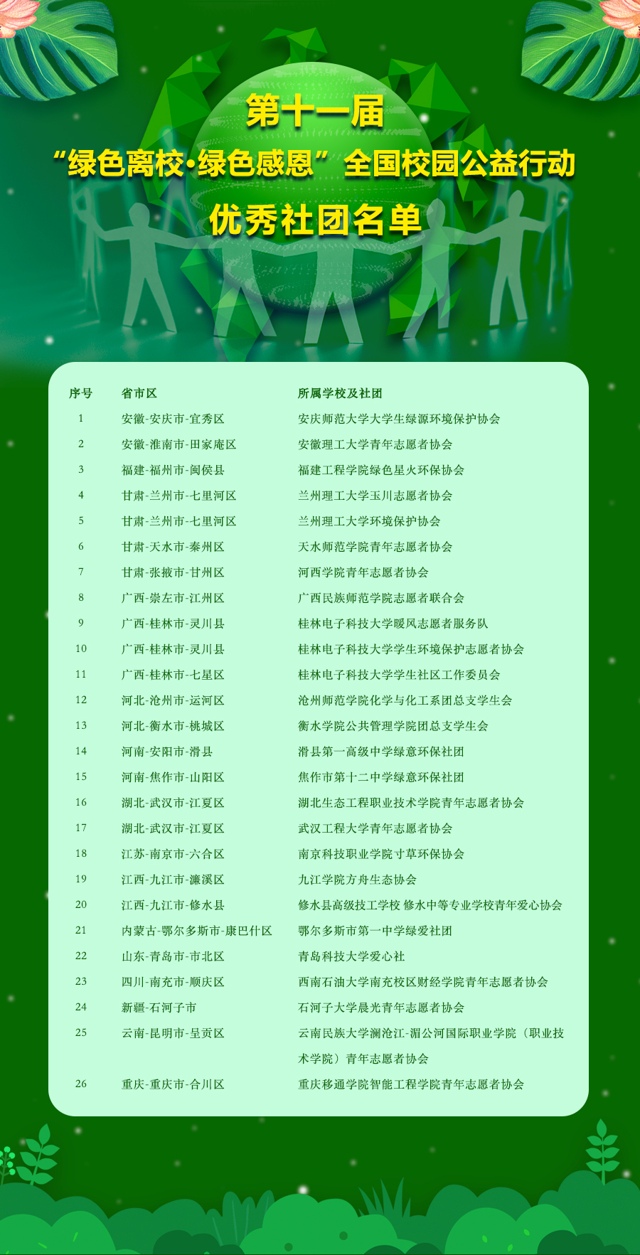 根据对项目主题、执行力度、成果展示、关注热度、线上点赞量等方面的综合评比,焦作市第十二中学绿意环保社团等26个社团获得“优秀社团”称号,安徽理工大学刘阳等144位同学(含主题歌曲大赛7名获奖者)获得“优秀志愿者”称号,李红香等11位协调员获得“优秀协调员”称号,现将本届活动各项获奖名单公布如下: